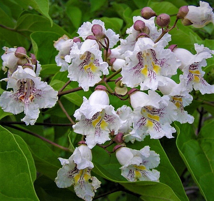 Летом катальпа расцветает, демонстрируя роскошные соцветия, которые могут достигать 30 см в диаметре и имеют запах, сравнимый с акацией и сиренью. А крупные цветы в виде махровых колокольчиков, открывающиеся в июне, не оставят равнодушными ни одного садовода. Внутри соцветий скрывается множество ароматов, которые наполняют пространство вокруг, создавая атмосферу сказки.