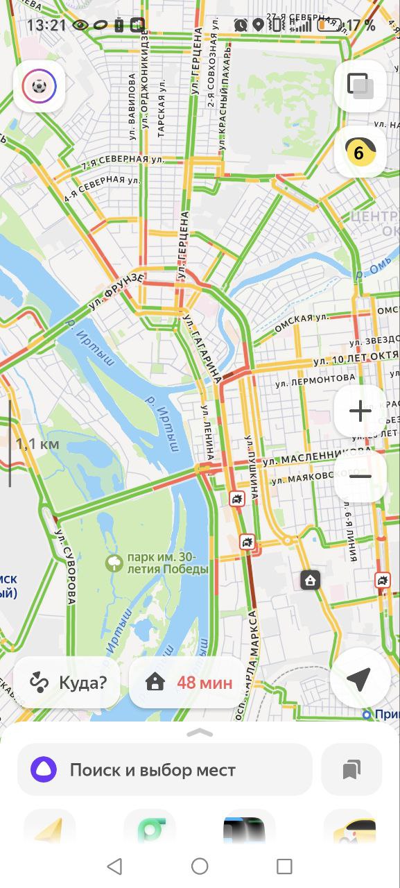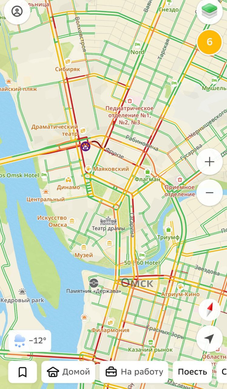 Омск в шестибальных пробках. Погодные условия несколько осложненили дорожную ситуацию и поездки по городу занимают больше времени, чем обычно.