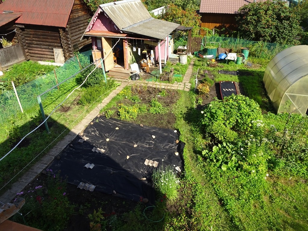 Кухонный уголок снова зарос травой, что требует вмешательства – либо покоса, либо глубокого перекапывания. Несмотря на непогоду и дожди, удалось провести значительные работы. Большинство грядок были перекапаны и прикрыты агроволокном, что создаст благоприятные условия для будущих цветников и зон отдыха.