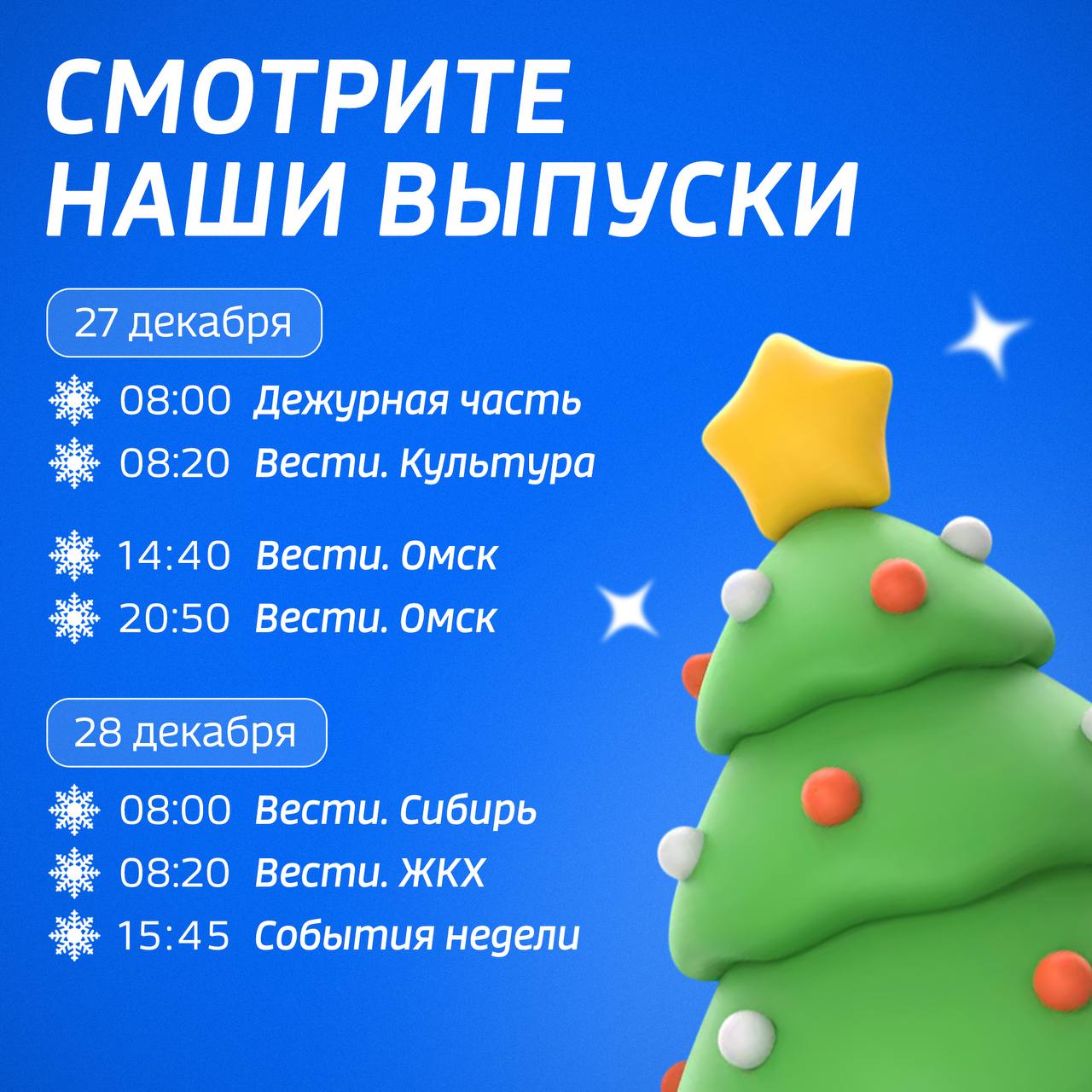 В субботу, 27 декабря, в 8:00 выйдет программа «Дежурная часть», в 8:20 — «Вести Культура». В 14:40 омичи увидят дневной выпуск «Вестей Омск», подведем итоги дня в 20:50.