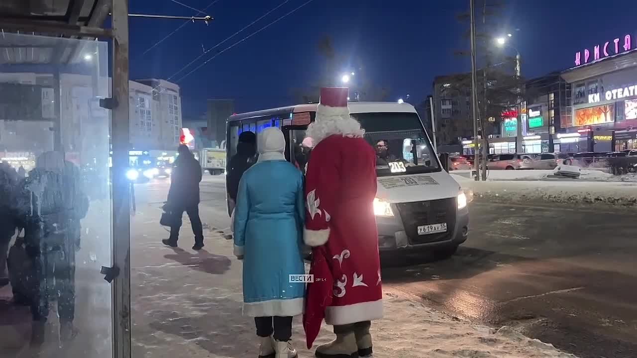 Вот, например, Дедушка Мороз с внучкой ждет общественный транспорт. Видимо, сани сломались