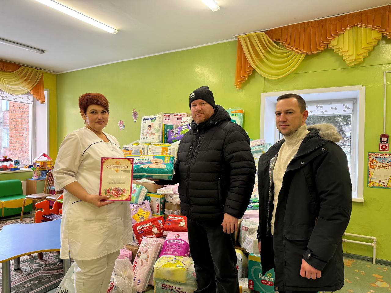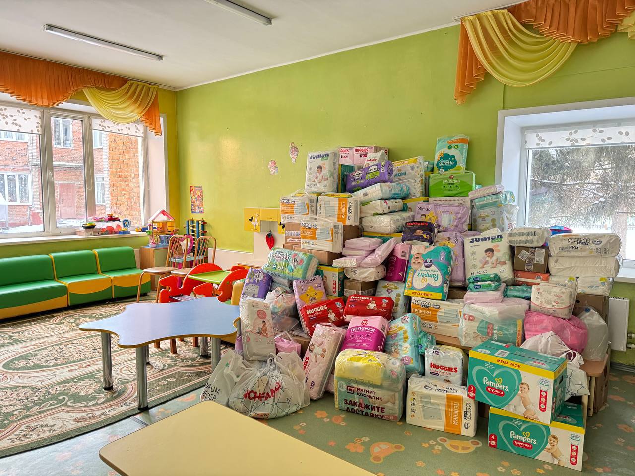 Сегодня в Дом малютки сотрудниками Министерства внутренней политики Омской области были переданы собранные в рамках акции товары для малышей. Это порядка 170 пачек памперсов и пеленок, средства для купания, шампуни, крема, зубные пасты, развивающие игры.