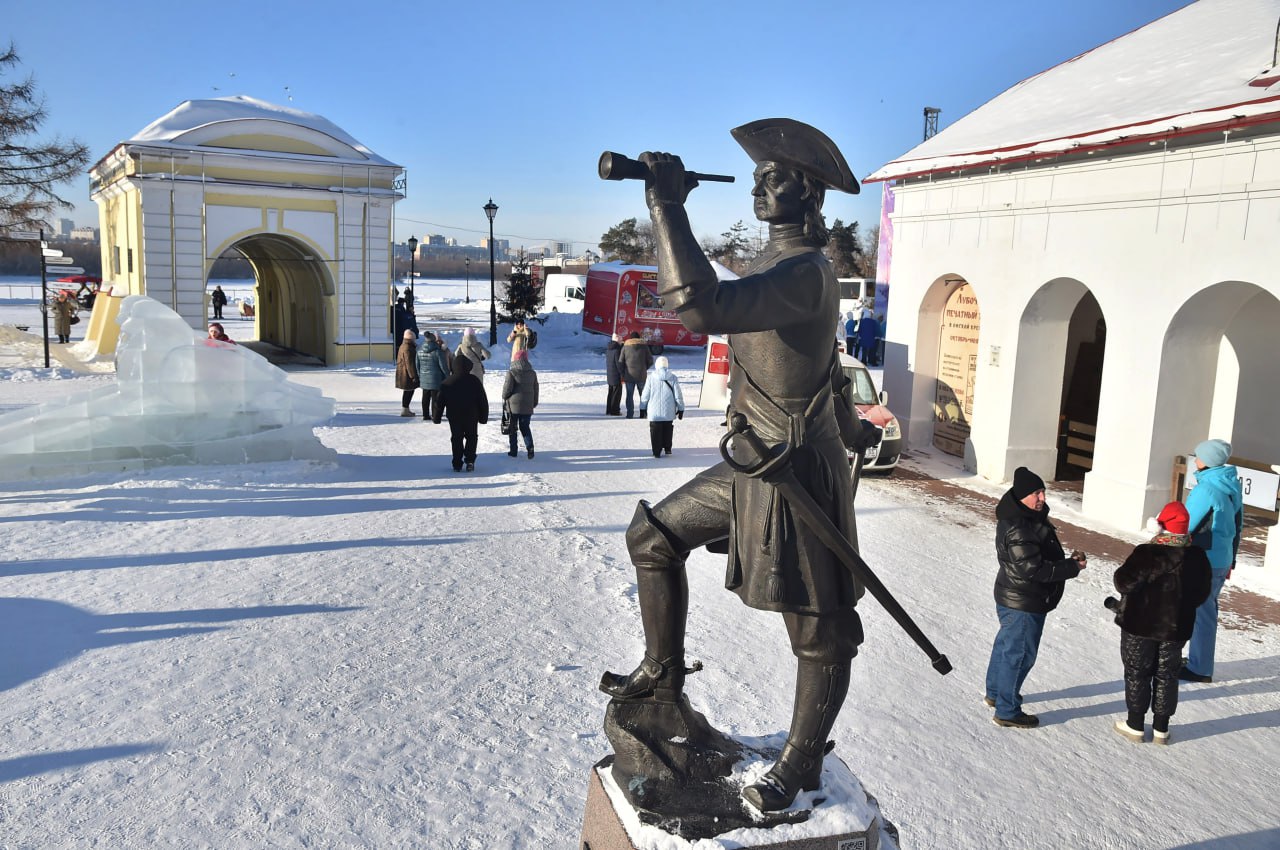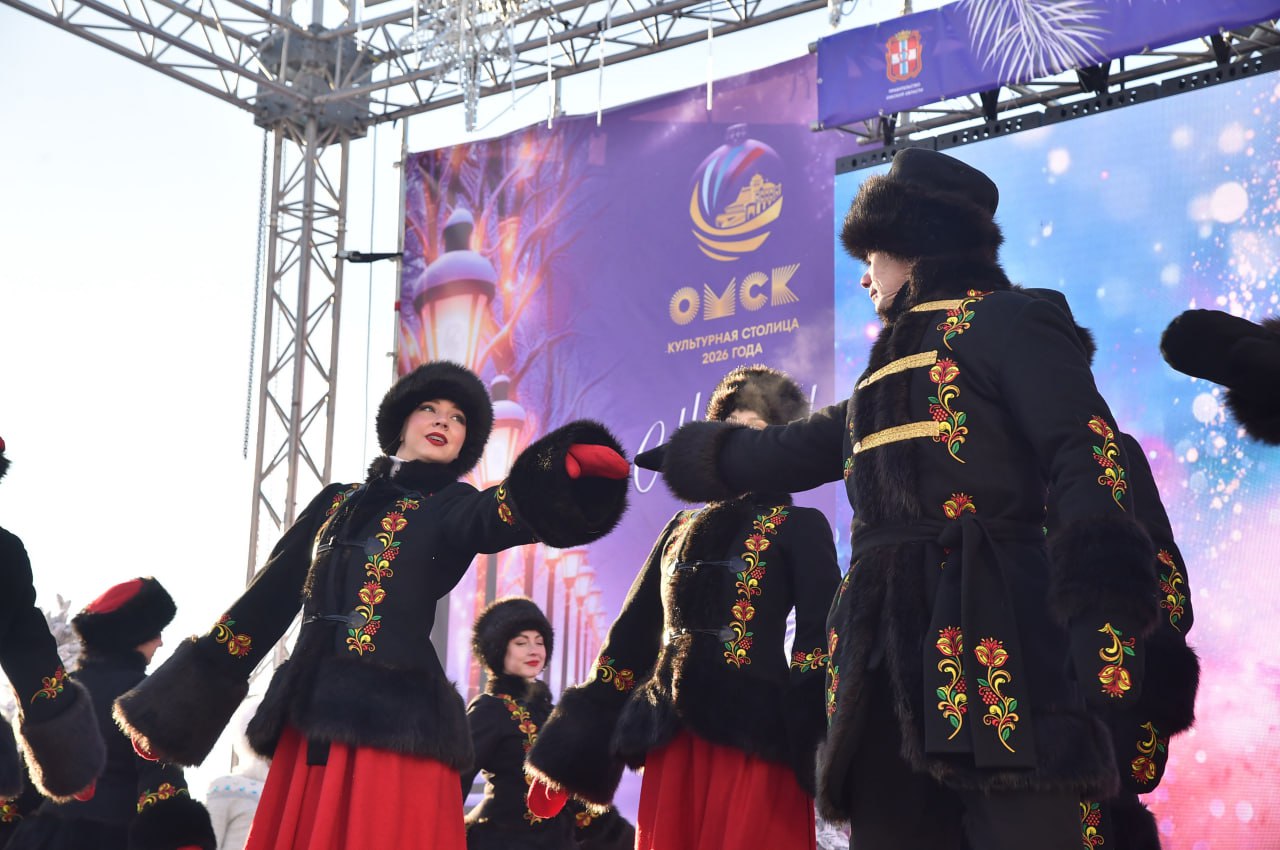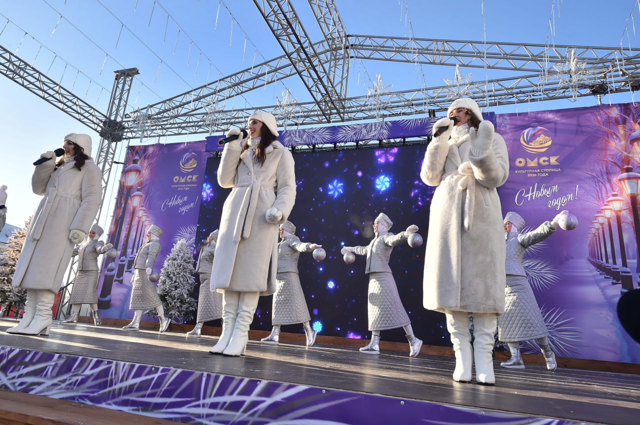 С наступающим праздником гостей поздравили Дед Мороз и Снегурочка, а также мэр города Сергей Шелест. Праздничное пространство украсили масштабные ледяные скульптуры: снегирь, жемчужина с надписью «Омск» и большая горка в виде Музыкального театра.