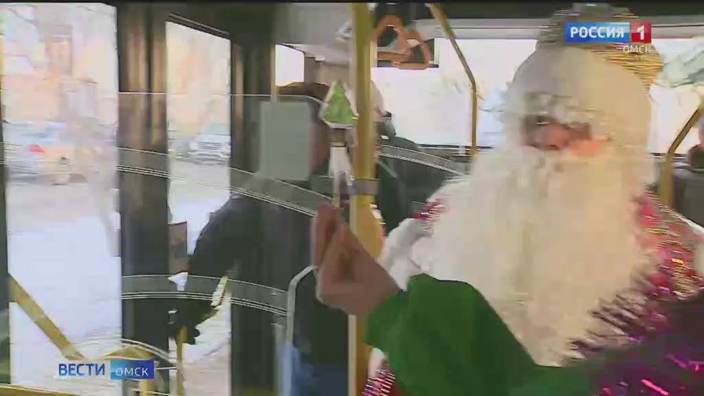На входе в троллейбус омичей встречает Дед Мороз и Ёлочка. Волшебник не только поздравляет пассажиров, но и дарит сладкие подарки.
