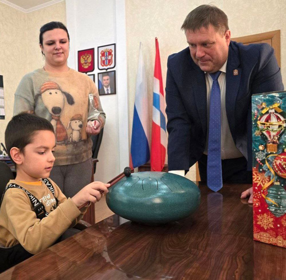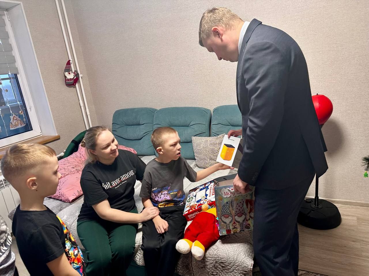 В рамках акции «Ёлка желаний» глава регионального Минтруда исполнила новогоднее желание Константина — вручила ему планшет, а также привезла сладкие подарки для него и его сестры.