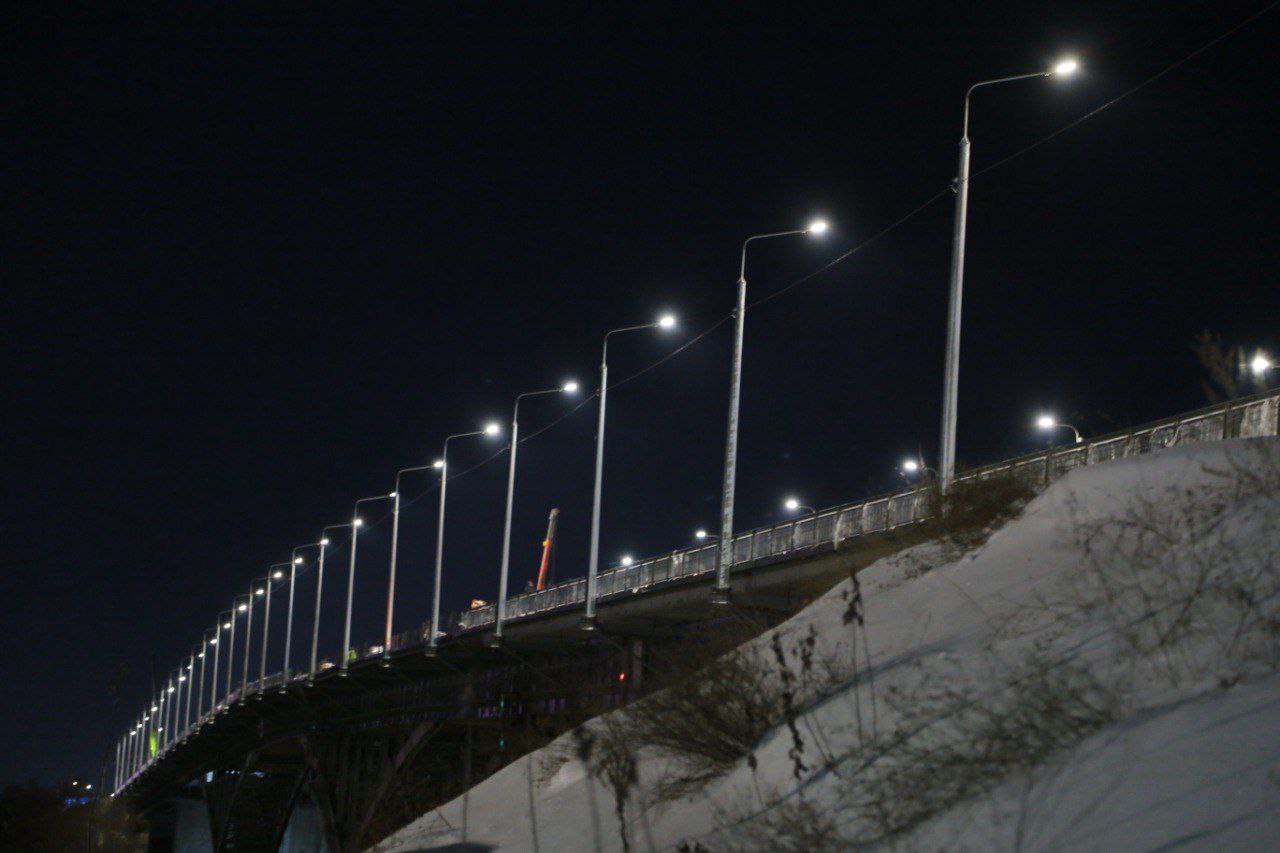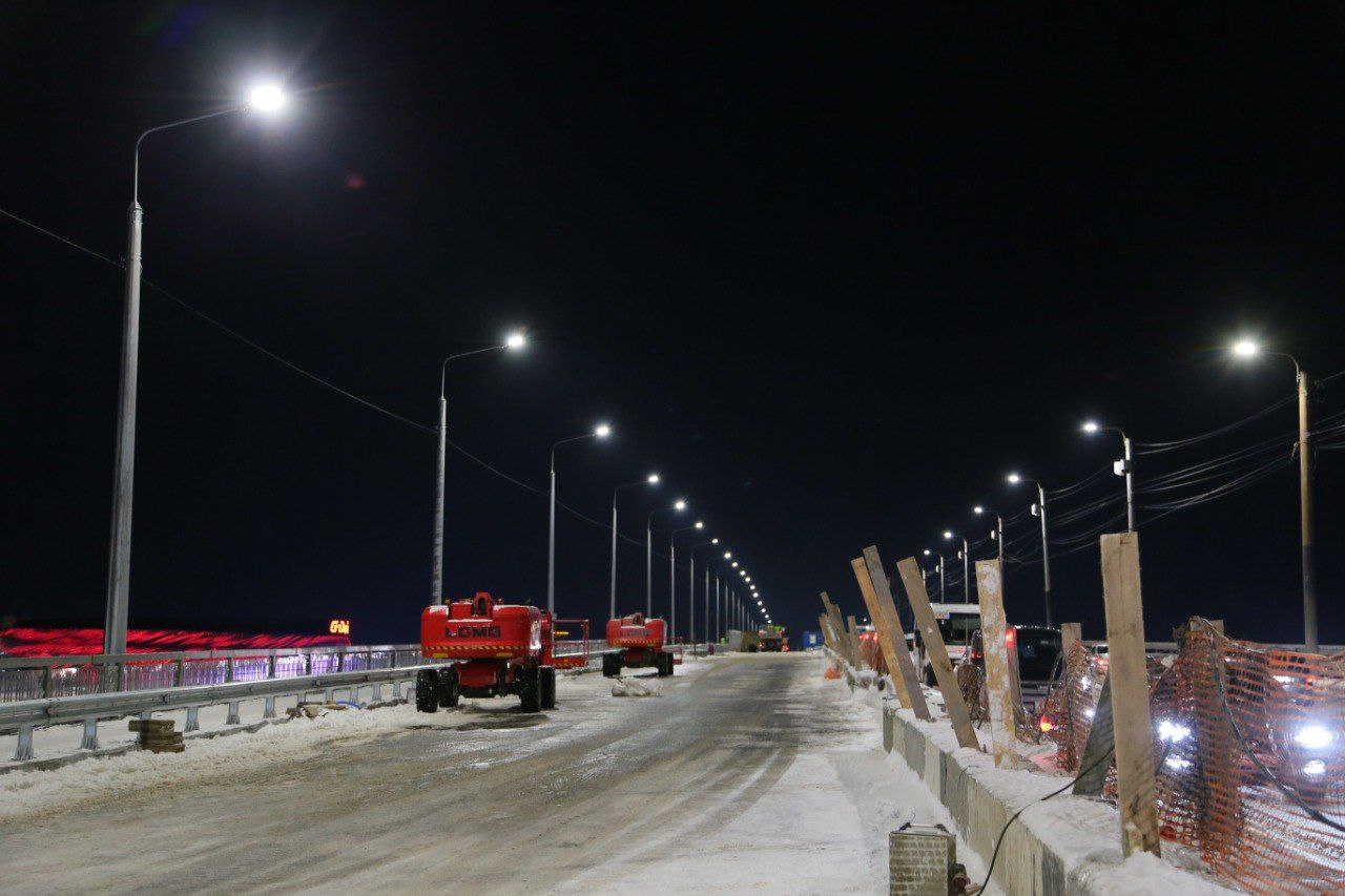 На мосту им. 60-летия ВЛКСМ, который капитально ремонтируется по нацпроекту, готовятся к переводу движения транспорта на другую половину. В течение ночи, к 7:00 8 января, будут смонтированы необходимые дорожные знаки, по-новому установлены делининиаторы, заново подключены реверсивные светофоры. Смонтированная система наружного освещения уже функционирует.