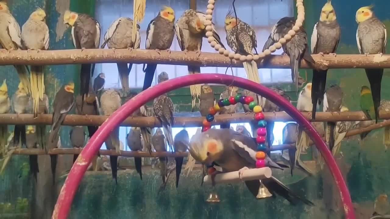 На видео один из пернатых — настоящий акробат: он висит на качелях и играет с колокольчиком, а вокруг — такие же любопытные и милые зрители.