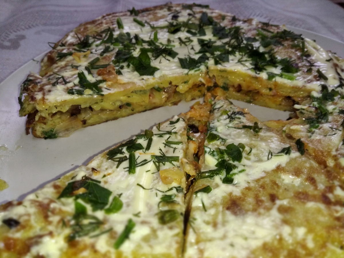 Готовый картофельный пирог можно украсить сметаной или майонезом и посыпать зеленью. Приятного аппетита!