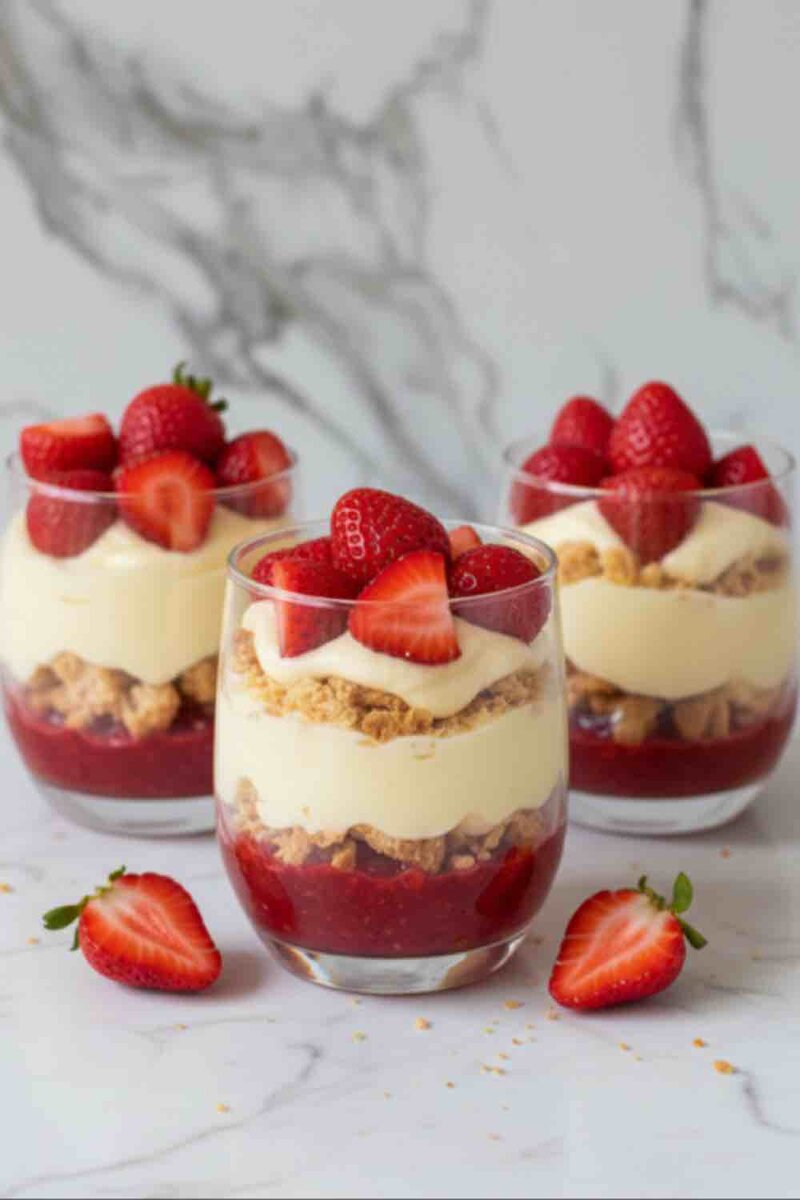 Затем перейдите к сборке: в прозрачные стаканы укладывайте слои. Начните с ягод, затем добавьте крошки печенья, нежный крем и снова печенье. Повторяйте слои, завершив десерт крошками и горстью ягод на верхушке для красоты.