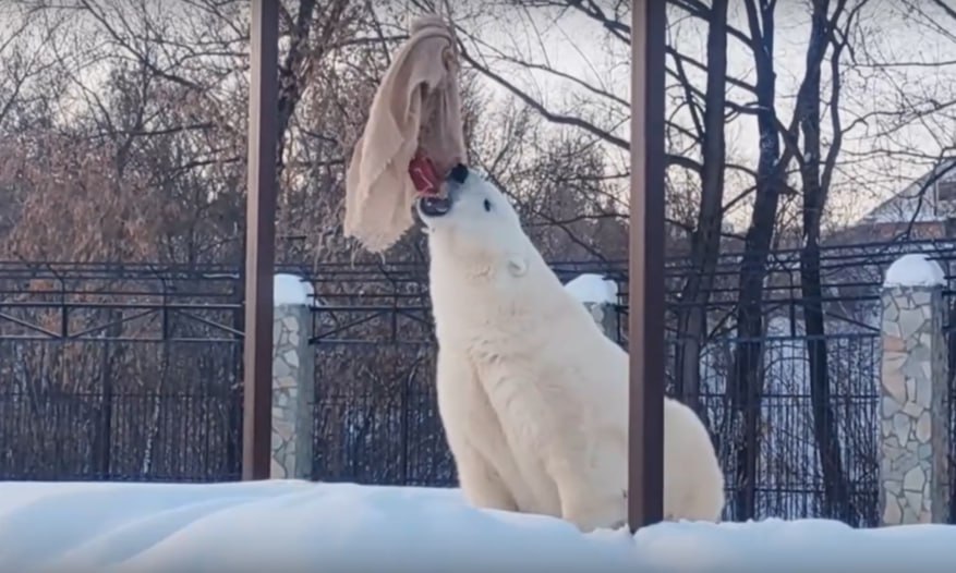 «Умиротворенная трапеза». Большереченский зоопарк в своем паблике опубликовал видео с показательного кормления белой медведицы Думки. Лакомство для нее спрятали в мешке.