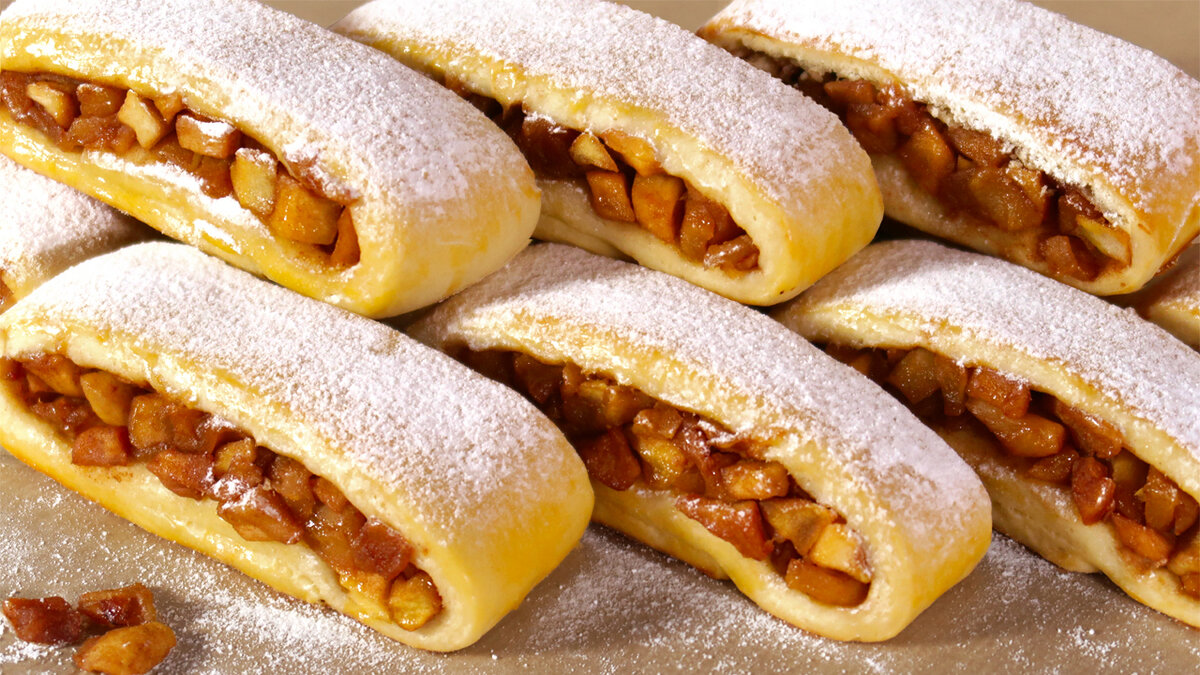 После того как тесто охладится, его раскатывают в прямоугольный пласт толщиной 3-4 мм. В центр выкладывают ароматную начинку, затем необходимо подогнуть края теста, образуя аккуратный валик. Каждый из получившихся кусочков аккуратно укладывается на противень швом вниз и смазывается смесью желтка с молоком. Выпекать печенье нужно в разогретой до 180 °C духовке около 25 минут.
