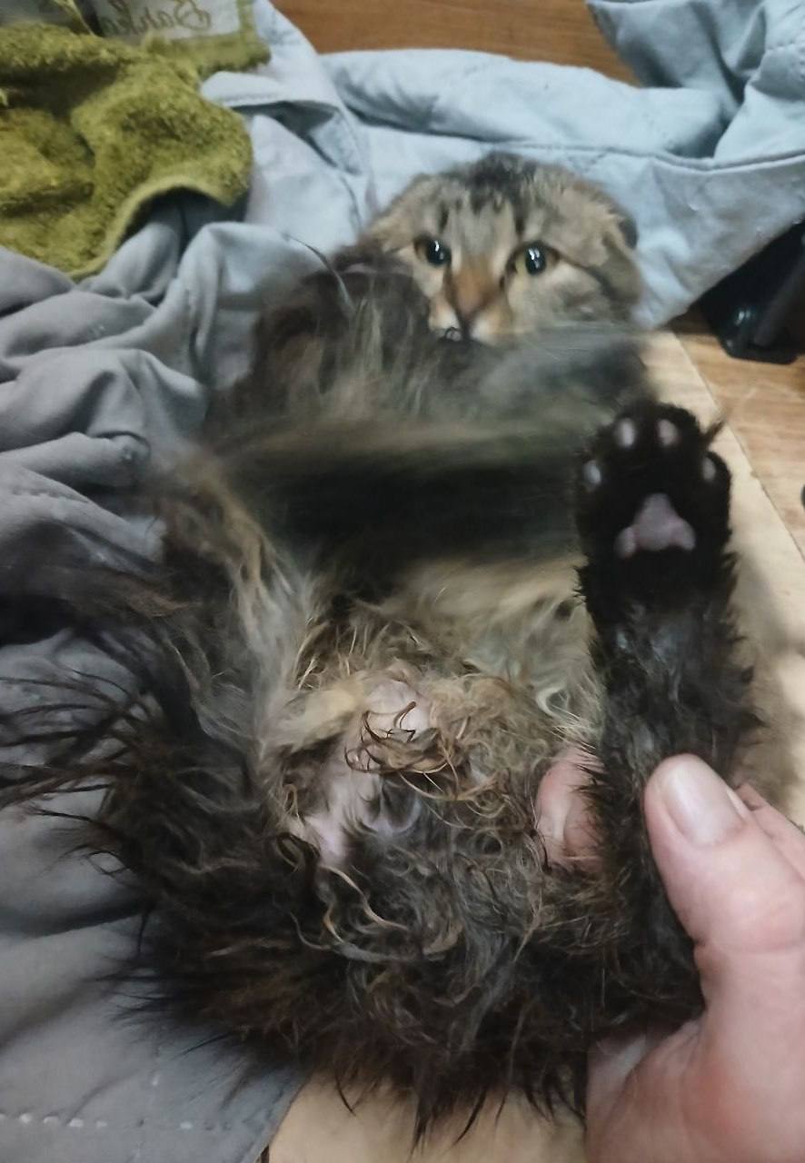 Освободившееся животное хозяйка отнесла домой, чтобы отогреть. На лапах и хвосте котёнка были огромные ледяные наросты. Сейчас котёнку примерно 4–5 месяцев.