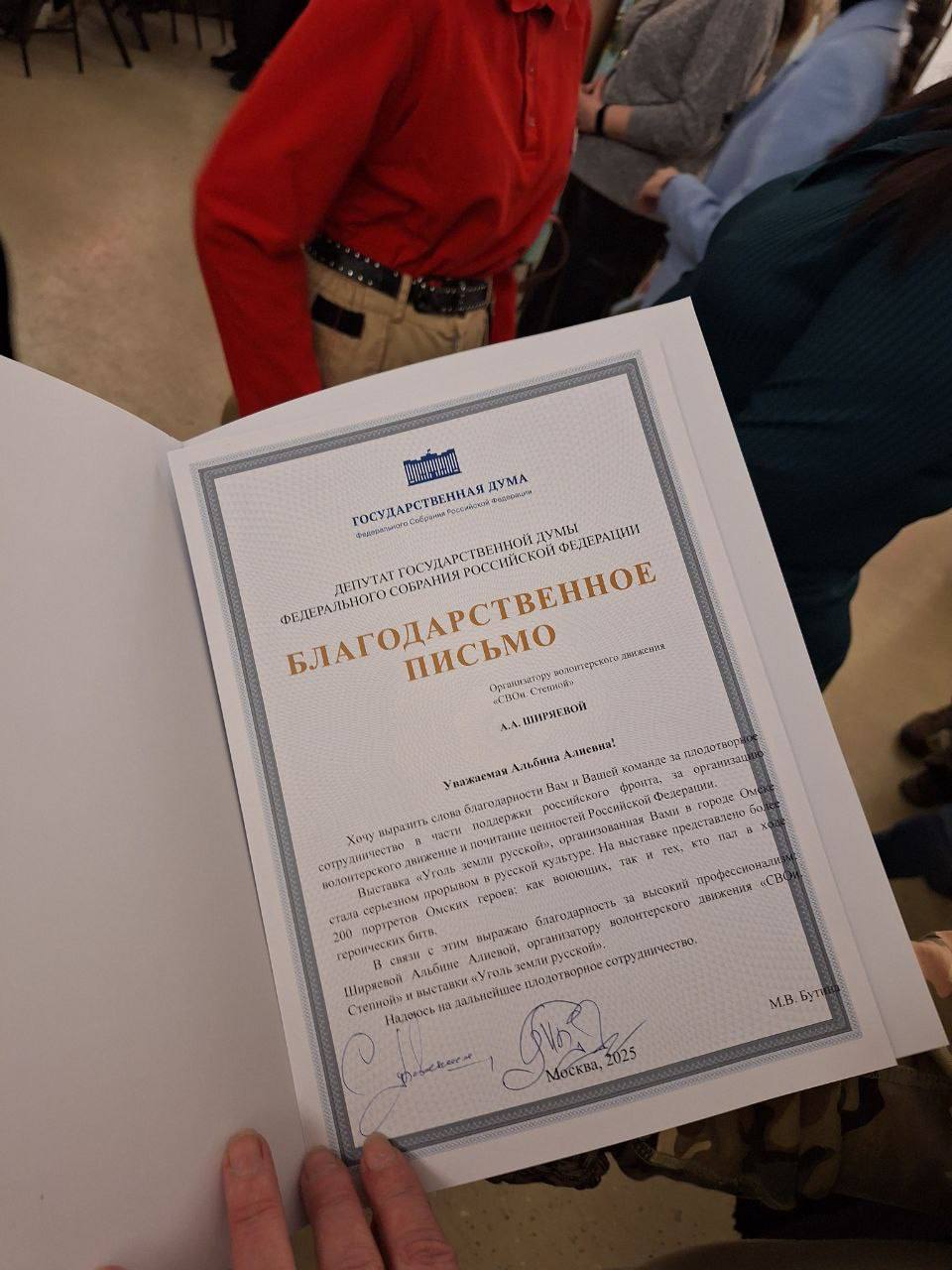 Кроме того, за помощь участникам специальной военной операции омичка отмечена благодарственным письмом депутата Государственной Думы Марии Валерьевны Бутиной.
