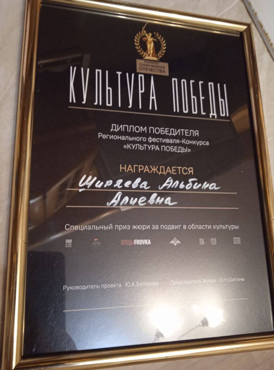 Поздравляю руководителя волонтерской группы «СВОи Степной» и куратора омского филиала передвижной выставки «Уголь земли Русской» Альбину Алиевну Ширяеву с победой в фестивале «Культура Победы», организованном Комитетом семей воинов Отечества Российской Федерации.