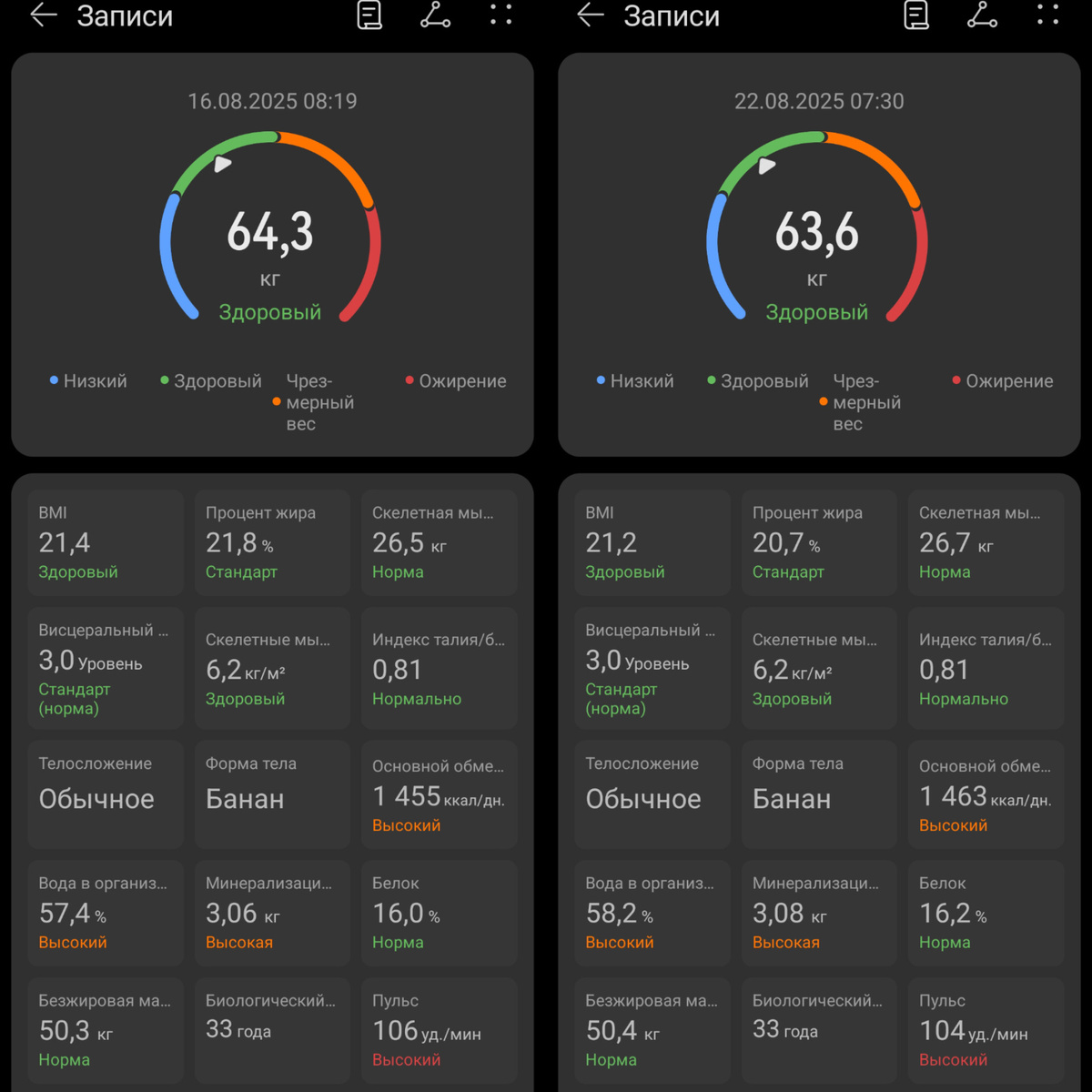 - Процент жира снизился с 21,8 до 20,7