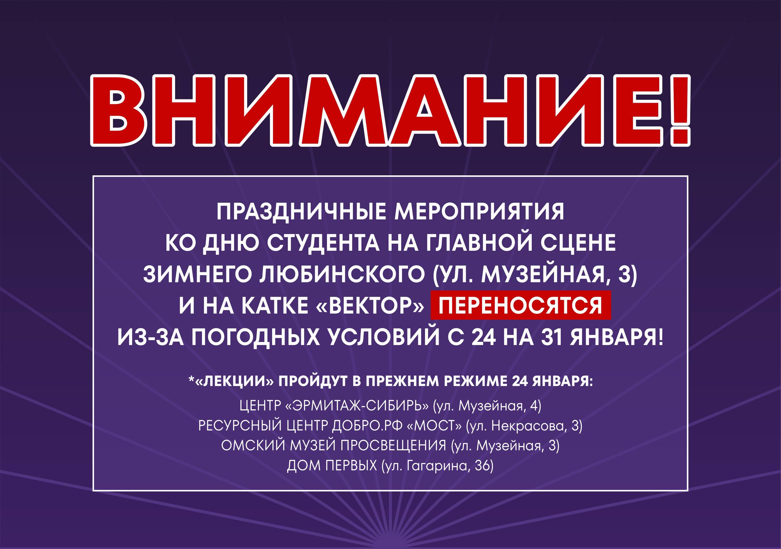 Друзья, с большим сожалением сообщаем, что праздничные мероприятия ко Дню студента на главной сцене Зимнего Любинского (ул. Музейная, 3) и на катке «Вектор» переносятся из-за погодных условий на 31 января!