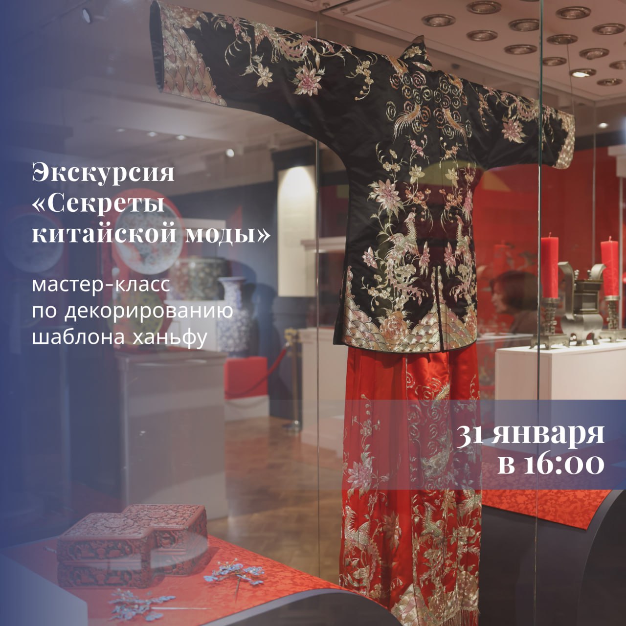 На экскурсии ребята познакомятся с культурой Китая на примере произведений декоративно-прикладного искусства XVII–XX веков, созданных в различных техниках и материалах: фарфоре, перегородчатых и расписных эмалях, резных изделиях из нефрита, слоновой кости, дерева, красного лака, инкрустированной мебели, шелковых одеяниях, тканях, вышивке. На мастер-классе мы поговорим о традиционном китайском костюме и выполним проектный эскиз ханьфу на картоне, декорировав его различными узорами.