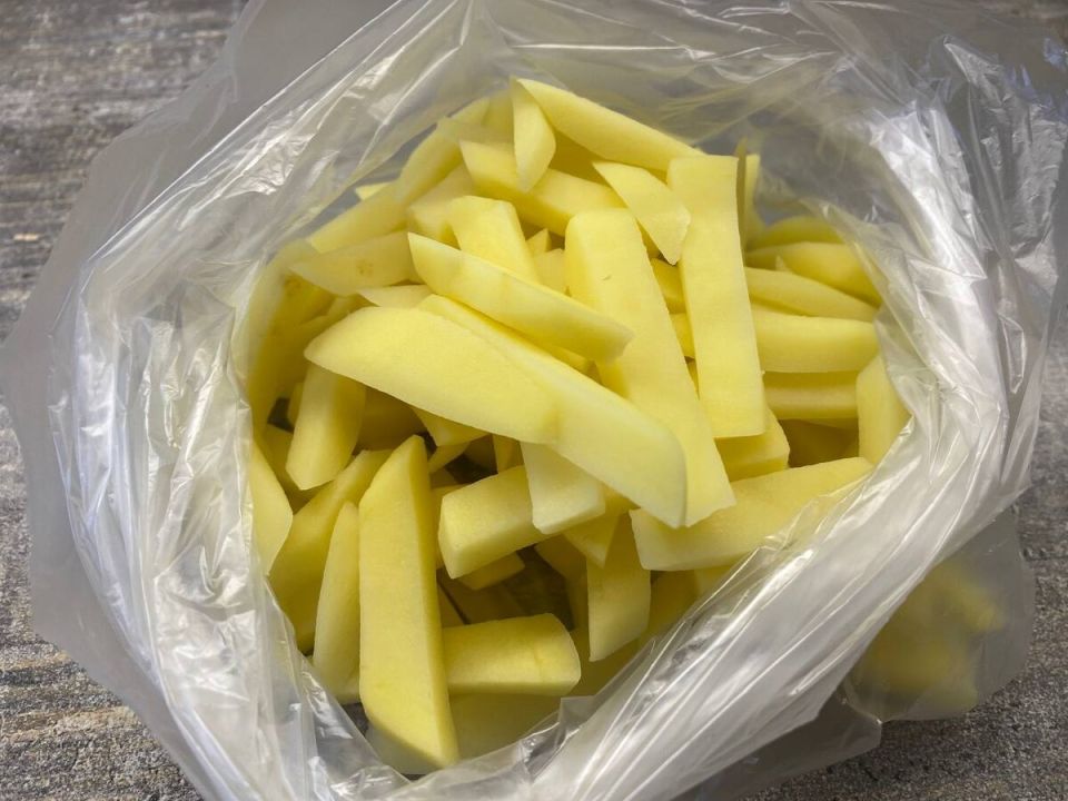 3. Переложить картошку в полиэтиленовый пакет. Добавить растительное масло и специи, хорошо перемешать. Пакет экономит время на мытье посуды!