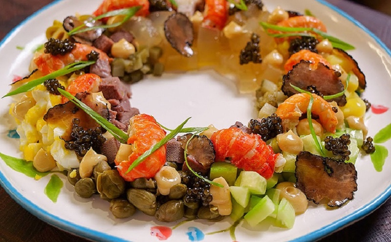 Сервировка — отдельная история. Компоненты выкладывали по кругу, сверху располагали раковые шейки, ломтики трюфеля и каперсы, а завершающим штрихом становилась черная икра и зелёный лук. Майонез подавался отдельно; и только перед подачей гости соединяли ингредиенты, чтобы сохранить текстуры и живые вкусы каждого элемента.