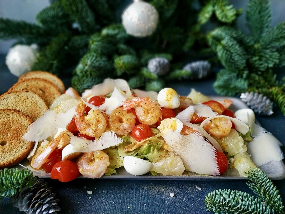 Хрустящие ломтики багета создают основу, на которой держится нежная креветочная текстура и освежающие дольки грейпфрута. Яйца добавляют мягкость, помидоры — сочность, а заправка связывает все ноты в легкую симфонию.