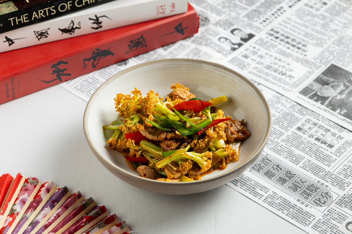 Чтобы сохранить текстуру, капусту нарезают небольшими соцветиями и слегка замачивают в подсоленной воде, затем хорошо отжимаются. Свинина выбирается с жирком — именно он и дарит глубокий аромат во время жарки.