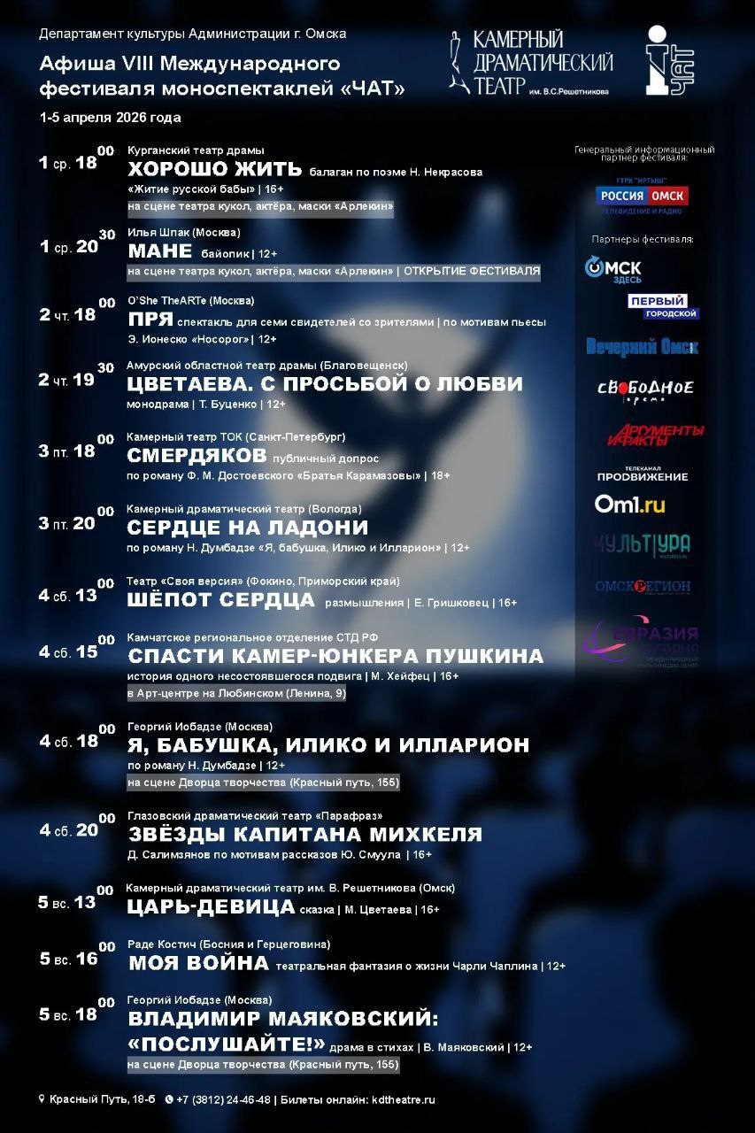 В апреле Омск в статусе Культурной столицы России примет VIII Международный фестиваль моноспектаклей «ЧАТ». В афише — 13 сценических историй от театров из Москвы, Вологды, Камчатки, Благовещенска, Кургана, Приморского края, Удмуртии и впервые — из Боснии и Герцеговины.