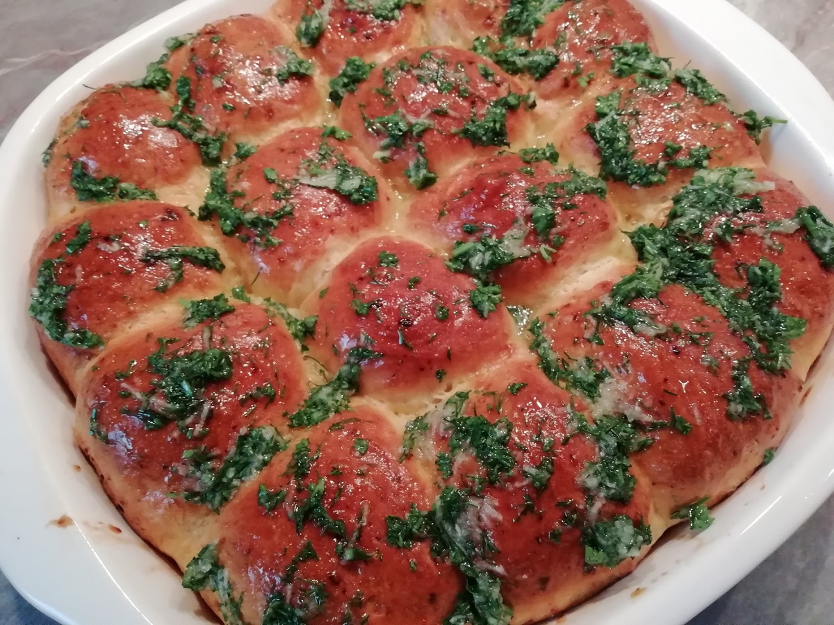 Разогреть духовку до 200°C. Затем смазать подошедшие булочки взбитым яйцом и выпекать около 20-25 минут до золотистой корочки. Пока булочки в печи, готовится чесночная заливка: перемешать масло, нарезанный чеснок, зелень и соль.