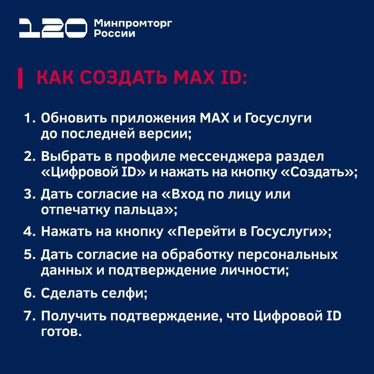 Подробную инструкцию по созданию Цифрового ID с помощью национального мессенджера МАХ дали в Минпромторге России. В МАХ-канале ведомства рассказано, как пользоваться сервисом и почему это безопасно.