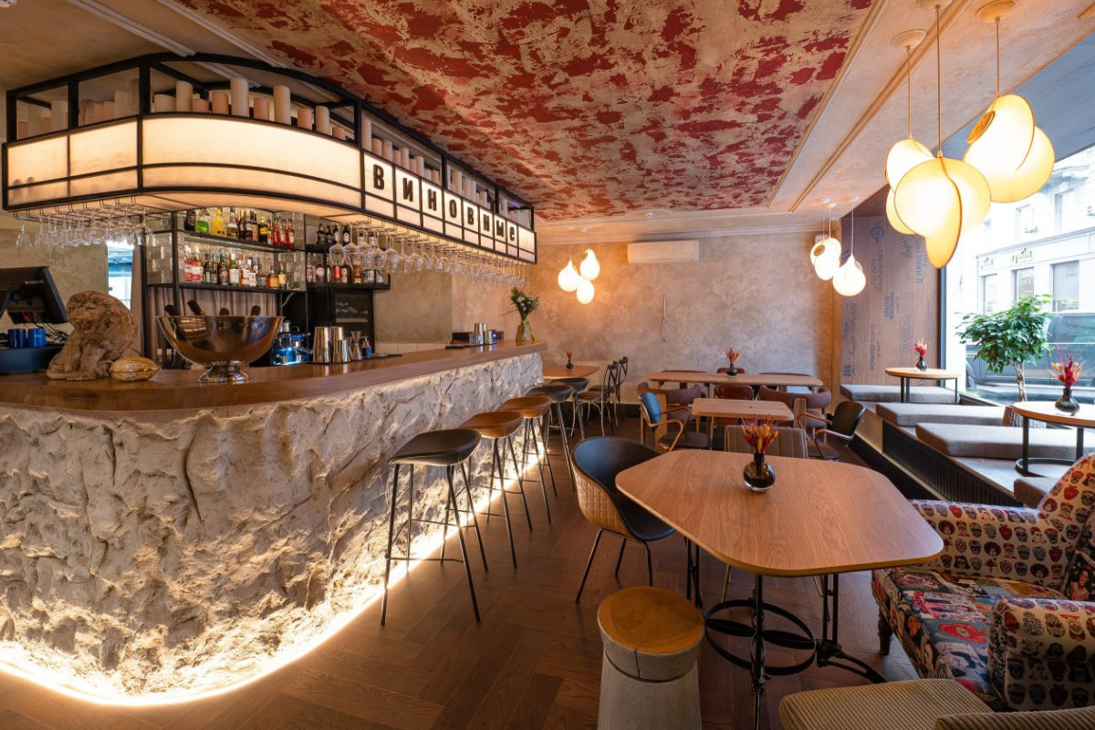 Название «Виновные» иронично отражает концепцию заведения, сосредоточенного вокруг культуры вина. Вместо традиционной книги отзывов посетителям предлагается «книга виновных», куда каждый может оставить свои пожелания, признания или просто добрые слова. Интерьер оформлен в теплых тонах, создавая уютную атмосферу. Современные картины на стенах и приглушенное освещение небольших дизайнерских светильников создают особое настроение. Гостям доступны как мягкие диваны, так и эффектная барная стойка из натурального камня.