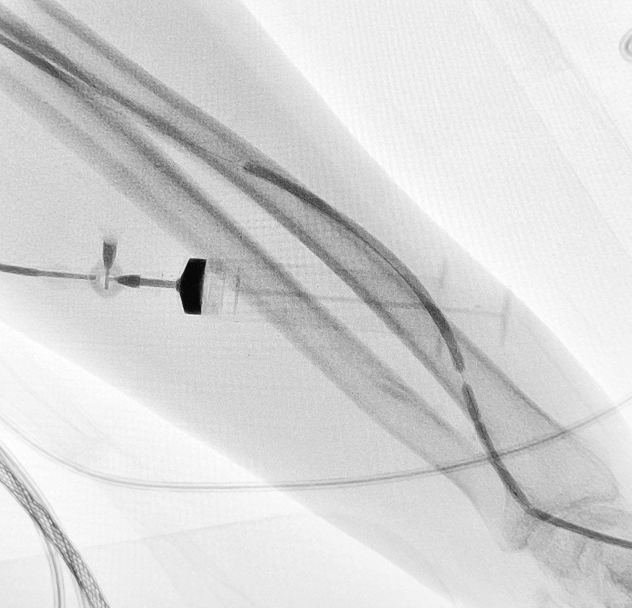 Врачи пошли по щадящему пути: через небольшой прокол под местной анестезией они провели катетер, устранили закупорку и расширили сосуд с помощью баллона. Всё — под рентген-контролем и без большой операции.
