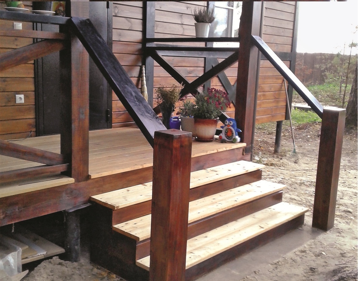 Теперь пришло время установить пустотелые опорные столбы. На них потребуется заранее подготовленный брус, который фиксируется с помощью сантехнического дюбеля и клея. В конечном итоге крепятся поручни и ограждение. Поручни делаются из того же бруса, что и на террасе, обрабатываются морилкой и надежно крепятся с помощью саморезов.