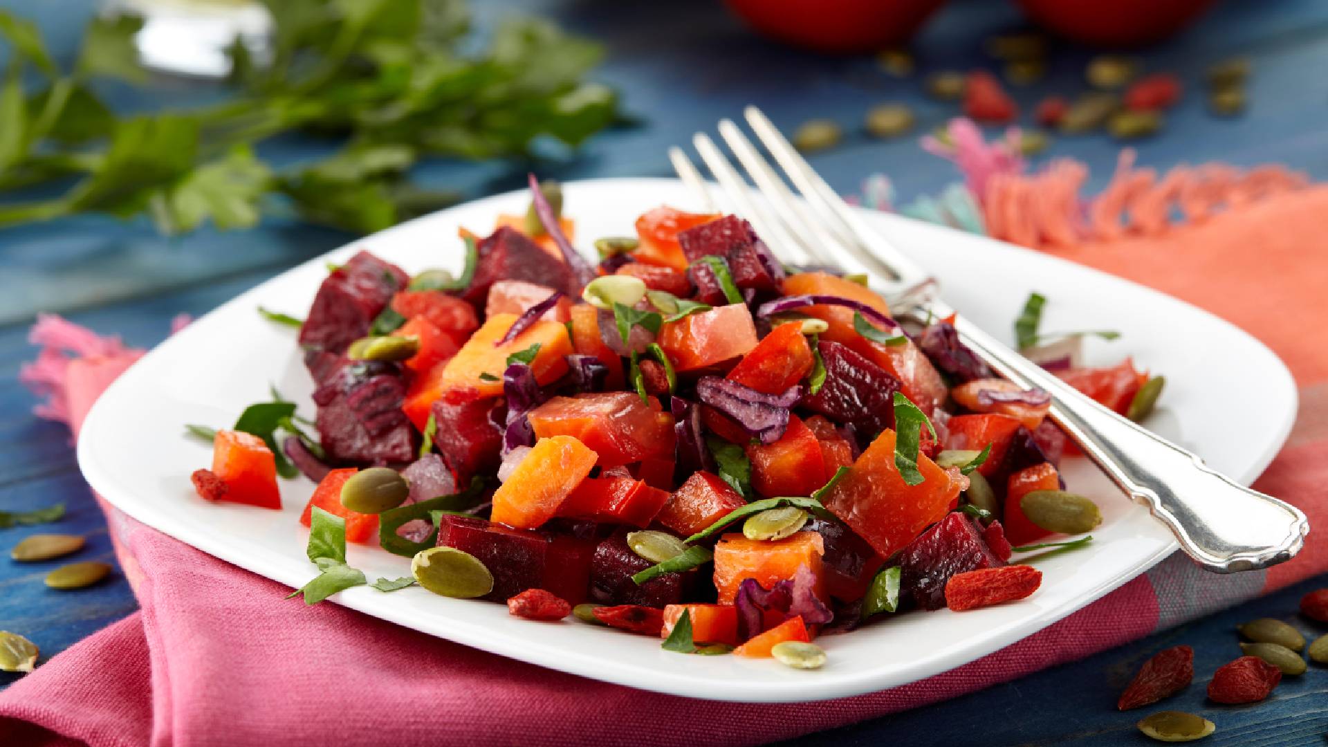 Овощные блюда обязательно должны быть в меню каждой семьи. Этот легкий салат — хороший источник витаминов, минералов и пищевых волокон. Домашние оценят его вкус по достоинству. А еще блюдом можно угостить тех, кто постится.