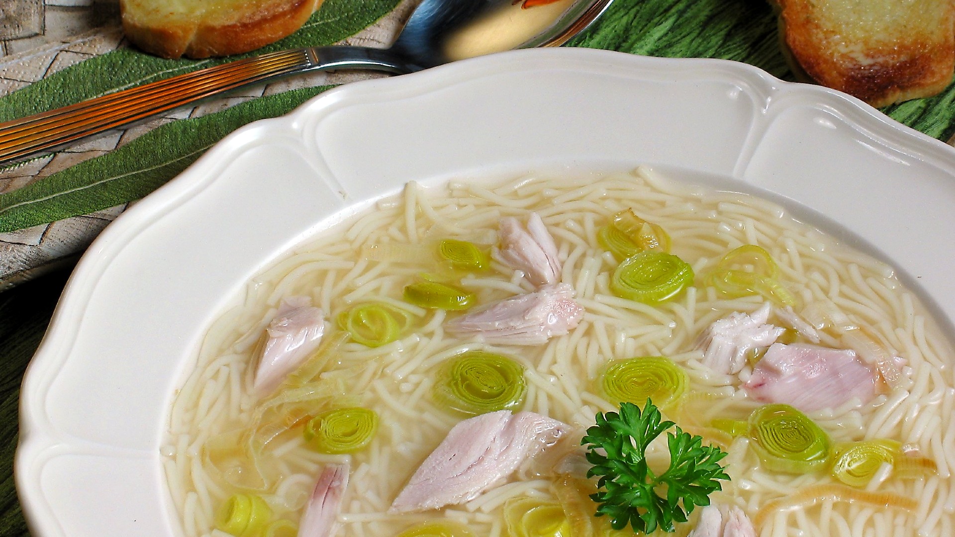 После добавления овощей, суп варится еще 15 минут, а потом добавляются финальные ингредиенты: спагетти, соль, специи и лавровый лист. После это суп варится еще 10 минут, а потом настаивается под крышкой.