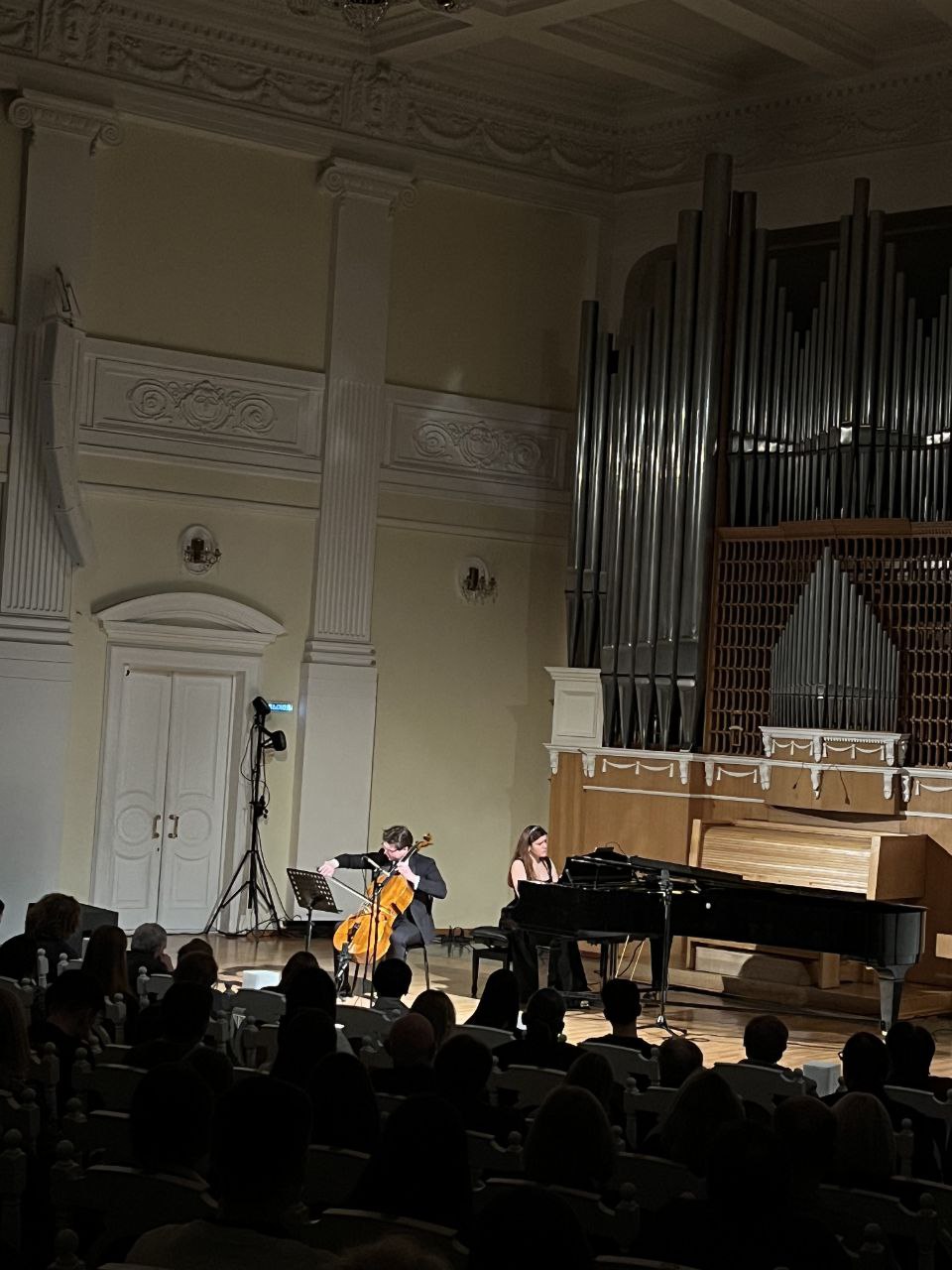 В Органном зале Омской филармонии выступили Павел Романенко (альт), Василий Степанов (виолончель), Гайк Казазян (скрипка) и Зарина Шиманская (фортепиано).