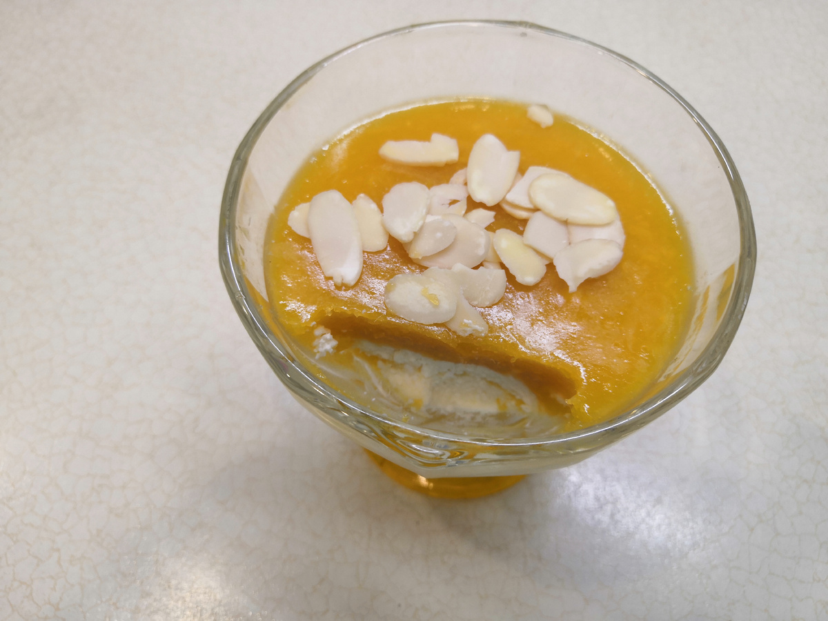 Начинать сборку десерта следует с выкладывания творожной массы в стаканчик, затем сверху добавить манговое пюре. Поместить в холодильник на два часа для застывания. После того как десерт готов, его можно украсить, например, миндальными лепестками для дополнительного шарма.