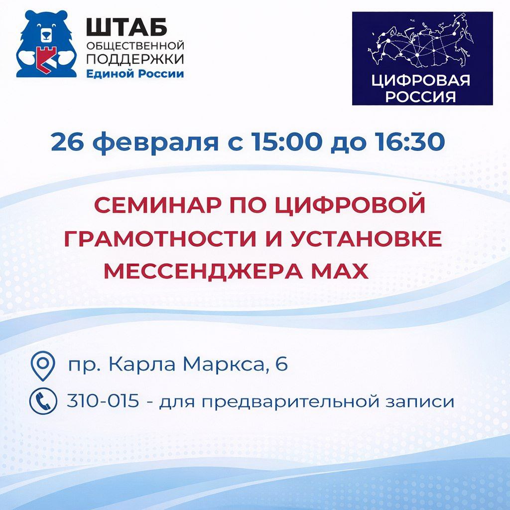 Приглашаем на семинар по цифровой грамотности и установке мессенджера Max, которое пройдет 26 февраля в 15:00 в Штабе общественной поддержки Единой России (пр. Карла Маркса, 6).