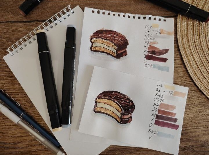 Для реализации идеи вдохновения чоко-паем был выбран маркерный скетч, созданный еще в детстве. Один из рисунков был выполнен дочкой, что добавило уютной нотки в данное творческое занятие.