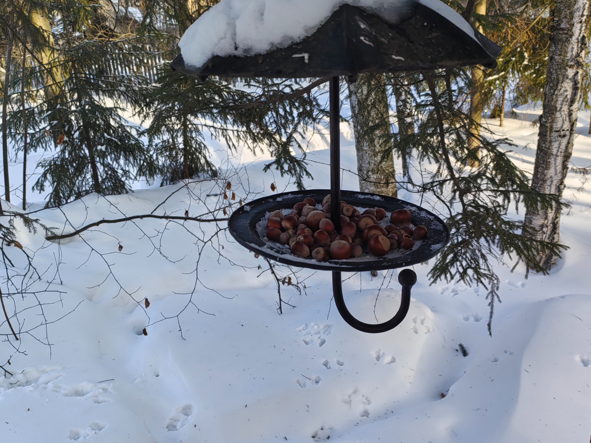 Зима на даче приносит свои неповторимые ощущения. Утром всё начинается с непривычного ритуала — подготовка корма для птиц и белок. В этом году креативная беличья столовая появилась в виде металлического зонта, заполненного орехами.