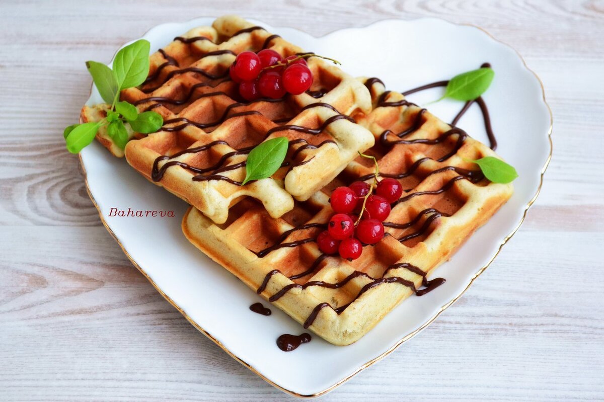 Готовые вафли стоит полить растопленным шоколадом, а для этого плитку шоколада необходимо поломать на кусочки и растопить на водяной бане. При подаче десерт можно декорировать свежими ягодами красной смородины и листьями мяты или базилика.