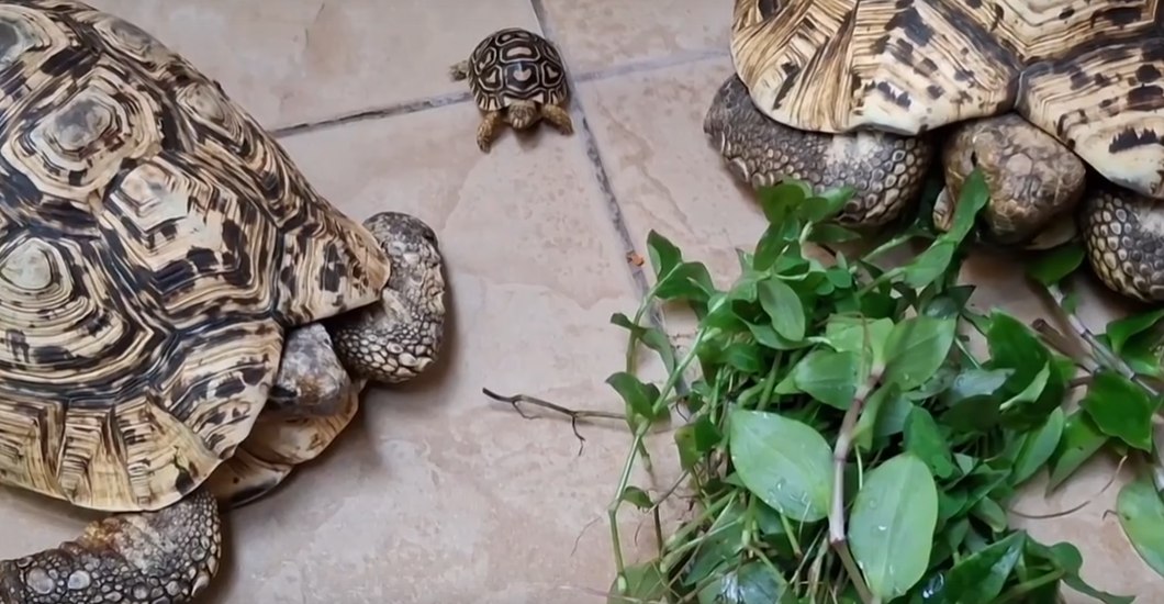 Малыша решили познакомить с родителями, но те не оценили. Папа спрятался в панцирь и не вышел. Мама увлеклась обедом и оторвалась от еды лишь на секунду — когда кроха подполз и ткнулся в лапу