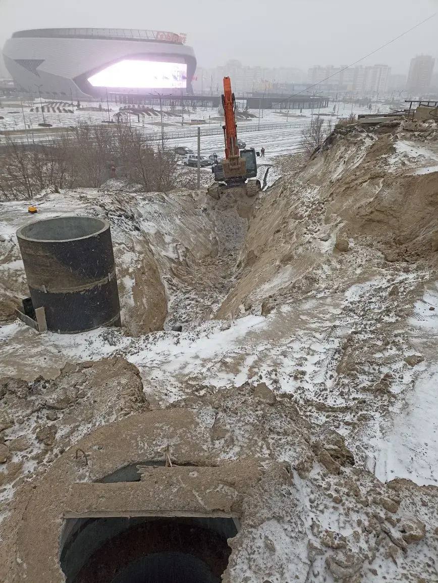Продолжается строительство новой ливнёвки и на подходе к объекту со стороны Левобережья. Там уже сформирован ещё один котлован глубиной восемь метров под дождеприёмные и смотровые колодцы и трубопроводы.