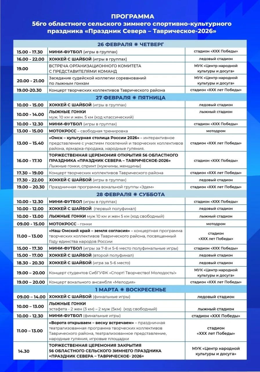 С 26 февраля по 1 марта в Таврическом впервые состоятся финальные соревнования 56-го областного сельского спортивно-культурного «Праздника Севера-2026». Более 400 спортсменов разыграют медали в четырех видах спорта: лыжных гонках, мини-футболе на снегу, хоккее и мотокроссе.