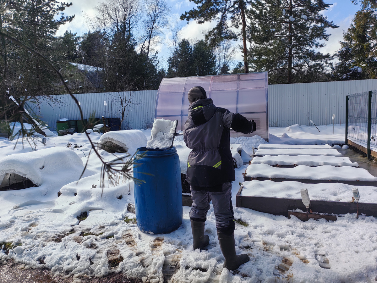 Сейчас самое время заполнять поливные бочки снегом, чтобы использовать эту ценную ресурс для полива рассады и всходов. Снег начнет таять лишь с приходом тепла, а чтобы не терять драгоценную влагу, стоит набивать бочки плотно.