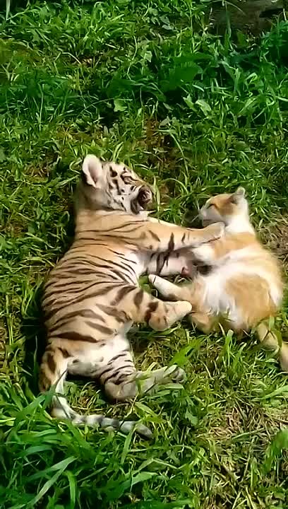 По видео видно, что полосатому малышу всего два месяца, а его друг чуть старше — около трёх месяцев, и они весело проводят время вместе.