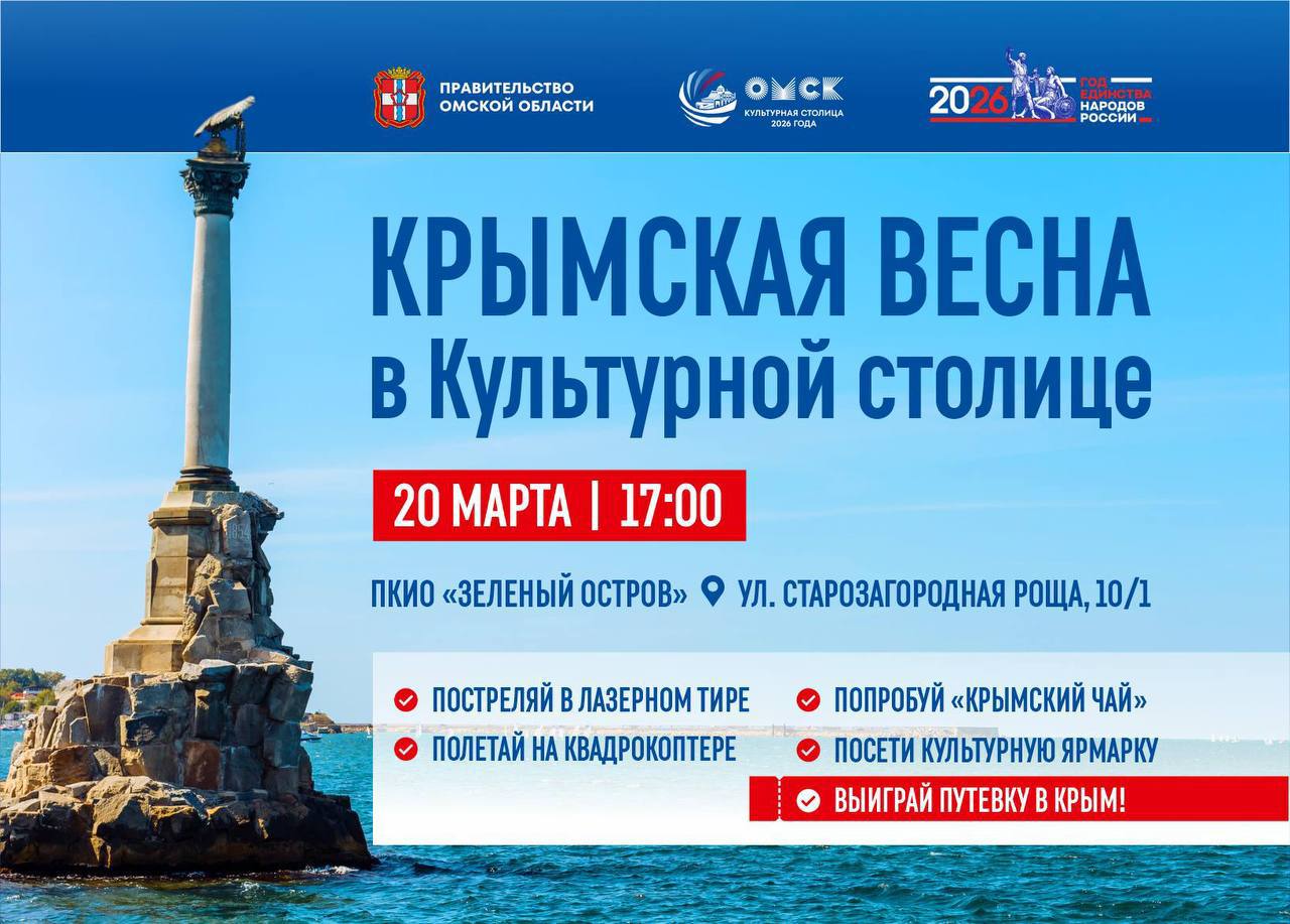 А 20 марта в честь Дня воссоединения Крыма с Россией всех омичей ждет яркий весенний фестиваль в парке «Зеленый остров» с 17:00 до 19:00! Праздничный концерт, интерактивные локации, полет на квадрокоптерах, стрельба в лазерном тире, «Крымский чай» и полевая кухня, розыгрыш крутых призов, среди которых абонемент в лучшие театры Культурной столицы и не только… главный приз - ПУТЕВКА В КРЫМ