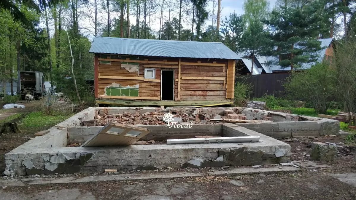 Сначала дом поднимали с помощью пневматических домкратов, что позволяло поднимать его равномерно со всех сторон, что снижало риски перекоса. Работы по разборке старого фундамента заняли два дня и потребовали вызова миниэкскаватора с гидромолотом, чтобы быстро устранить старый мусор.