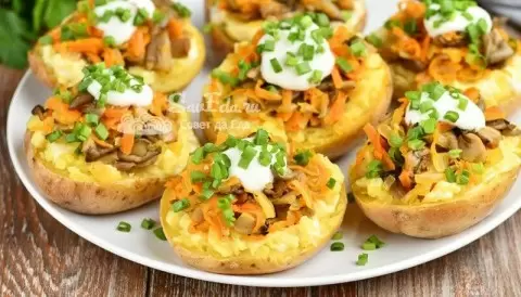 Когда картофель готов, его разрезают пополам, мякоть аккуратно размять, добавляют начинку из грибов и овощей и щедро поливают майонезом перед подачей на стол.