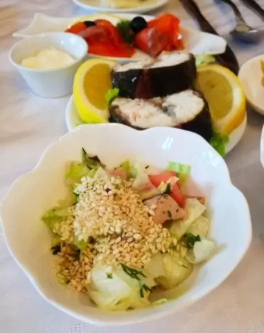 Салат из печени трески с айсбергом и кунжутом
