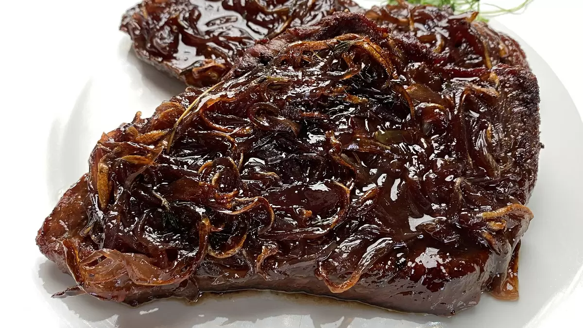 Блюдо подается горячим, где сочное мясо идеально дополняется сладким карамельным луком, а вино придает ему насыщенный вкус. Этот гастрономический шедевр станет настоящим украшением любого стола!