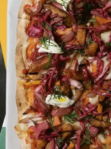 Главным штрихом этой уникальной пиццы является свекольный мусс, который придаёт блюду яркий цвет и неповторимый вкус. Но это ещё не всё! Пицца дополнена такими интересными компонентами, как: